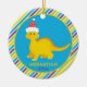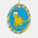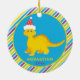 Decorate your tree this holiday season with this cute Christmas ornament featuring cute yellow dinosaur wearing a red holiday hat on a blue and yellow circle frame, and multicolored striped background. Add your child's name and year to personalize.