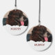 Add a personalized touch to your porch or garden with this custom wind chime. A fun white paint style border at the lower edge of the pendulum disc makes a perfect backdrop for the fun cranberry or dark red colored letters spelling out your dog's name. You can add the same photo and name to each side or put different pictures and/or names on either side. Create the perfect personalized gift for your favorite dog lover today!