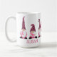 Whimsical gnomes holding pink breast cancer awareness ribbons.