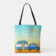Cute travel tote bag for vacationers, road-tripping retirees, full-time RV-ers, and side hustlers who work from a tiny house on wheels (THOW). A wee blue car pulls a festive looking polka-dotted blue and yellow camper. The sky is clear, the sun is shining and it's time to GO. The text on one side of the tote says, "Beverly's Travel Bag" and can easily be personalized with your own name and words. The other side of the bag displays the same graphics, without text.