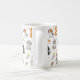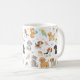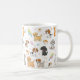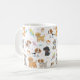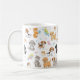 This adorable white ceramic mug features a cheerful, all-over pattern of various cute cartoon pets. The design includes playful illustrations of puppies (including a beagle and a golden retriever), kittens, a poodle, a budgerigar, and a guinea pig. The whimsical pattern also has small details like paw prints, butterflies, and fish, making it a perfect gift for any animal lover or pet enthusiast.
