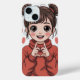 "Adorable phone case featuring a cute anime girl in a red sweater making a heart with her hands, surrounded by floating pink hearts. The design has a soft, cheerful vibe and adds a playful, heartwarming touch to your phone."