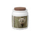 This awesome candy jar features a beautiful photograph of a cute pink spotty pig emerging from some tall grass.