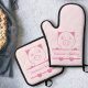 A pink Oven Mitt & Pot Holder Set with a monogrammed cute pig and customizable text inside. Perfect to make a gift to a farmer, best friend or for newlyweds or just for your kitchen decoration!