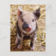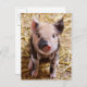 Photograph of an adorable pink piglet with black spots sitting in hay looking forward.