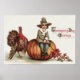 This pilgrim is having a relaxing Thanksgiving. This vintage Thanksgiving print depicts a cute little pilgrim boy sitting on top a pumpkin, a turkey by his side. The boy is holding branch of Fall leaves.