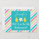 A creative way to ask your bridesmaid to be a part of your wedding, this invitation features a lovely pink, green and blue diagonally striped background with a blue and white box in the middle. The box has a template for customizing her name with "Will you be my bridesmaid?" written in lovely white font. Personalize yours today!