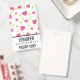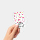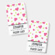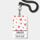Name badge with a cute pattern composed of pink and green tumbling hearts on a white background.