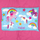 Decorate your little girl's bedroom or nursery with this cute colorful unicorn pillow case. Pillow case has a pink unicorn, purple unicorn, and two white unicorns. In the background are beautiful rainbows and clouds. Add your kid's name at the bottom for a personal touch.
