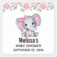 Baby shower stickers with a cute pink elephant watercolor illustration. She has cute pink and white polka dot ears and a pretty pink ribbon bow on top of her head.