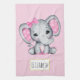A kitchen towel with a cute pink elephant watercolor illustration. She has cute pink and white polka dot ears and a pretty pink ribbon bow on top of her head.
