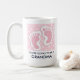 You're going to be a grandma (or other name) coffee mug. Designed with an adorable image of pink baby girl footprints with a heavy white outline.
