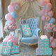 Cute pink and blue wrapping paper with baby kittens sitting in pink flower pots on a blue background. Some have pretty ribbons in their hair.
