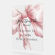 A gorgeous feminine bridal shower welcome sign with a large pink watercolor bow angled to the side and draping across most of the sign. A text template is included with the popular "She's tying the knot" theme. Personalize with your event info. This beautiful acrylic sign is a popular choice in party and event signs with a modern look.