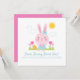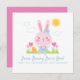 A cute pink personalized Easter card featuring a pink Easter Bunny surrounded by Easter Eggs and tulips. Cute for a daughter or granddaughter. Designed for you by Blackberry Boulevard.