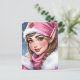 Cute personalized Christmas postcards with an adorable illustration of a female elf in pink with snow falling in the background. On the back you can personalize your address and holiday greeting.