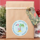 Kitchen Stickers with a cute illustration of a pink flamingo wearing a red santa hat. Standing on a mound of sand with a tropical palm tree behind. Light blue background. Personalize with a name.