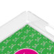 Adorn your room with a custom tray featuring a pink glitter bow pattern background, and encircled customizable monogram. This design is shown in Delta Zeta colors, pink and green, and makes a lovely dorm room gift for college students and sorority sisters.