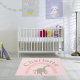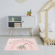Pink area rug with a rainbow and a cute dinosaur. Personalized with a name, ideal for a baby nursery or girl's bedroom.