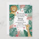 Celebrate a special first birthday with these adorable watercolor jungle animals. This sweet design features a lion and giraffe peeking through tropical leaves and flowers in soft pinks and greens. Perfect for a little girl’s woodland or safari-themed party invitation or decor.