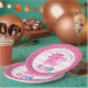 “Roar”. A fun, whimsical, playful visual of a cute, bold, kawaii, pink brontosaurus, and fun, handwritten typography over a light pink and white striped circle background, honors the birthday child. An adorable pink crown pattern overlaying dusty rose pink is on the rim, framing the illustration. Add love and joy to your party whenever you use this simple, modern, and whimsical, personalized paper plate. Your choice of 2 sizes: 7” or 9”, round or square shape, or 7” bowl. This charming paper plate is guaranteed to set just the right tone for your event! Matching invites, stickers, napkins, and other birthday goodies are also available in this special and fun collection.