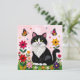 A sweet black and white tuxedo cat sitting in flowers and surrounded by butterflies. The art is in an impasto oil paper quilling style.