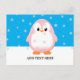 A cute pink penguin drawing. Baby animal postcards. Blue sky and snow flakes in the background. Edit text to customize. Gift idea for kids.