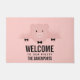 A welcome mat which says: Welcome to our pigsty, personalized with your family name. Designed with a drawing of a cute pink pig's face. Wearing a black bow tie. Lifted up by his black cloven hooves and peering over a table. Cute and whimsical drawing. Set on a pink background with some faded hearts here and there.