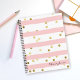 A fun pattern for girls with horizontal pink and white stripes with golden dots scattered about makes this a cute choice in notebooks. A text template along the left side of the design spells out your name or other desired text. Simply personalize the sample text as you wish for a custom notebook for home, office, or back to school.