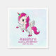 Personalized birthday (or other event) party napkins. Designed with a white winged unicorn with pink mane, tail and hooves. The horn has rings of rainbow color and looks like a candy lollipop. This cute unicorn is rearing up on its back legs. Sweet pink heart on its cheek and long girly eyelashes.
