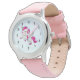 A watch with a white winged unicorn with pink mane, tail and hooves. The horn has rings of rainbow color and looks like a candy lollipop. This cute unicorn is rearing up on its back legs. Sweet pink heart on its cheek and long girly eyelashes.