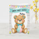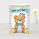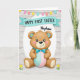 This card features a light brown plush-toy bunny sitting front and center with soft rounded shapes, shiny dark eyes, rosy cheeks, and a sweet smile that feels like it’s meant for a close friend 🐰. A small teal bow tie rests at its neck, and tiny blue flower accents sit near its ears, adding a gentle, affectionate touch. The bunny cradles a large oval egg split into two pastel halves: one light blue with fine white geometric detailing, and one pale pink with tiny star-like marks. The character and egg are framed inside a bright white oval that stands out against a background of weathered wooden planks in muted gray-brown tones. Near the top, a teal banner stretches across with a short celebratory message in white lettering, centered and easy to read. Above that, a draped garland of decorated eggs in pink, yellow, and blue runs from side to side, with a small 🌷 accent tucked into the festive look. In the lower corners, small yellow blossoms sit near the edge of the white oval, like little dots of sunshine against the wood.