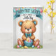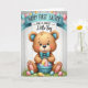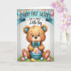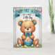 This design shows a soft brown, plush-like bunny with rosy cheeks and bright blue eyes, sitting on a rich green patch of grass dotted with tiny white flowers 🌷. A neat blue bow at its neck and a tender, inviting gaze give the scene a sweet, friendly closeness, as if it’s waiting to share a small surprise 🐰. Cradled in its arms is a light blue woven basket filled with speckled eggs in gentle pastel pinks, yellows, purples, and blues. A few more decorated eggs rest near its cushioned feet, adding little pops of color around the character. Behind everything, pale wooden panels with light texture create a cozy, rustic backdrop. Across the top, a teal banner stretches wide with the message in white lettering, and it’s outlined by a string of small, multicolored egg-shaped lights. The bunny’s fur is softly shaded, and the eggs show tiny speckles and a faint shine against the green grass.