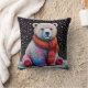 Polar bear sitting against a dark, starry background. The bear is rendered in a colorful, dot-style pattern that gives it a playful and whimsical appearance. It wears a vibrant orange scarf that adds warmth to the scene. The snowy ground beneath the bear is also illustrated with a dotted texture, and the surrounding stars and colorful dots create a festive, wintry atmosphere. The overall effect is bright and cheerful, blending elements of nature with artistic expression.