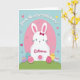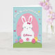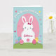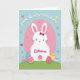 The front design shows a stylized white bunny as the main figure, with tall ears lined in pink with polka dots, a matching textured tail, and a bright fuchsia bow that adds a sweet, friendly touch 🐰. Simple dot eyes, a tiny nose, and fine whiskers give it a gentle expression, like it’s quietly leaning into affection. Behind the bunny sits a soft pink oval frame, and beneath its feet is a small green grassy mound. Around the mound are decorated eggs in lavender, light blue, fuchsia, and yellow, each with stripes, dots, or small pattern accents. The background is a light sky blue sprinkled with floating pastel hearts and a few tiny confetti-like dots 🌷. Curved text sits near the top in a dark contrasting color, and a single larger word is placed across the bunny’s body in a matching tone. The bunny’s fuchsia bow and pink ear details stand out against the pale blue background and the pink oval frame.