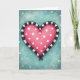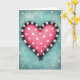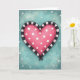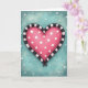 This greeting card shows a large pink heart in the center, filled with raised-looking white polka dots that give it a soft, cushy feel. A black-and-white checker pattern frames the heart, and a line of small red stitch marks runs along the edge like sewn thread. Near the bottom point of the heart, there’s a tiny black tie that looks like a little knot or bow. The background is a smooth teal-blue with a gentle painted texture that keeps the focus on the heart. White fluffy circles float around like bubbles or light snow, adding a sweet, dreamy touch. There isn’t any text on the front, so the design speaks for itself with a clear message of love 💘❤️. It’s a simple, warm way to share Valentine’s Day feelings with someone you care about 😘.