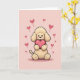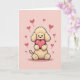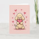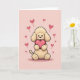 This greeting card shows a fluffy, cream-colored poodle sitting right in the center on a soft blush-pink background. The pup looks sweet and calm, with wide black eyes and rosy cheeks that make it feel friendly and loving. It’s holding a large, ruffled pink heart in its paws, like it’s offering it to someone special. Small red hearts float around the dog across the background, adding to the romantic mood. The fur is drawn with gentle shading, so it looks extra soft and a little puffy. There isn’t any text on the card, so the image does all the talking and keeps the message simple. It feels perfect for romance, friendship, or a kind note to someone you care about ❤️💌🍫. Hope it helps you share your Valentine’s Day feelings with someone who matters.