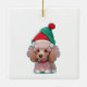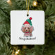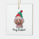 Frontview of a cute light brown poodle with a red Christmas hat; on the front of the ornament are the words "Merry Christmas!". The image as well as the text are placeholders - you can easily replace the image with an image of your own pet, and you can also easily change the words. The design was created using AI. Ideal gift for anyone who loves poodles or wants to give the ornament as a gift to a poodle-loving friend.