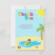 This adorable & cute girl's pool party birthday party Thank You flat card has Thank You written at the top in green, pink, blue and yellow. To the right, there is a sun. At the bottom, there is a cute brown hair girl sitting on a floating raft in a pool. There is some flip flop shoes, a lemonade, and a beach ball around the edge of the pool. In the middle, you can easily customize your thank you message or you can delete the text and hand write in your message at home. Graphics by JW Illustrations