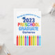 This adorable 2023 preschool graduation card features a cool grad cap above colorful writing and a row of crayons in rainbow. Cute preschooler graduate congratulations card in fun colors for the last day of elementary school with your kid's name personalized in blue. Congratulations to our PreK grad!