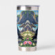 A puffin themed personalized tumbler. A beautiful vibrant colorful ai illustration of a puffin watching the ocean waves by the sea shore surrounded by rocks, dunes and flowers.