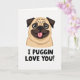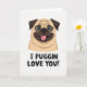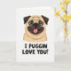 This card features a head-and-shoulders portrait of a small fawn-colored dog centered on a plain white background, drawing your eye straight to its wrinkled face and compact shape. The dog’s large, round, dark eyes have a tender, friendly sparkle, like it’s gazing at someone it adores ❤️. A wide grin shows a pink tongue peeking out, adding a flirty, affectionate energy without needing any extra scenery. Dark brown shading defines the snout, button nose, and softly folded ears, creating gentle contrast against the lighter fur. Beneath the illustration, a humorous message is placed in dark, thick, simple lettering that reads, “I PUGGIN LOVE YOU!” The text sits centered under the dog’s chin, with the strong dark color standing out clearly against the white space. The overall look stays minimal and sweet, with lots of open background that makes the face and message feel close and personal 🌼. The dog’s forehead creases and rounded cheeks are outlined with soft, tidy lines against the bright white backdrop.
