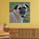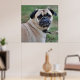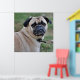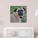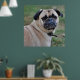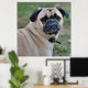 A photograph of an adorable pug staring at the camera with a piece of grass sticking out of his mouth.