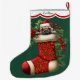 This Holiday stocking has an image of an adorable little Pug puppy peeking out of an ornate red stocking. The image is surrounded by holly, red berries, and poinsettia blooms, and is placed on a Christmas green background. A white scalloped edge design bordered in red holds your customized name at the top. The back of the stocking is identical to the front.