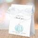 Cute baby boy shower party favor box featuring "thank you" in simple grey typography and a stylish script with swashes and a watercolor of a blue pumpkin.