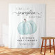 Cute baby boy shower tapestry welcome sign and photo prop featuring a pastel blue pumpkin watercolor and "A Sweet Little Pumpkin Is On His Way" written in a mix of grey typography and a stylish script with swashes. Personalize with the name of the mother-to-be and the shower date.