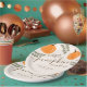 A cute fall themed gender neutral baby shower paper plates. This design features a modern calligraphy script font, orange pumpkins and green Eucalyptus branches.