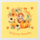 A cute pumpkin fairy holding a happy carved pumpkin surrounded by an autumn wreath of flowers, pumpkins and leaves.