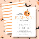 Simple and modern Halloween baby shower paper invitation featuring a cute pumpkin on a clean white background. With the words " our little pumpkin is on his way " and stripe pastel orange and white reverse. Ready for easy personalization.