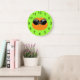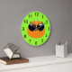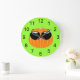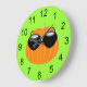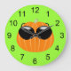 A Cool Pumpkin with sunglasses on a lime green background adorns this clock. This would look fantastic on any child's wall. Select from several shapes and sizes. Clock background is customizable.